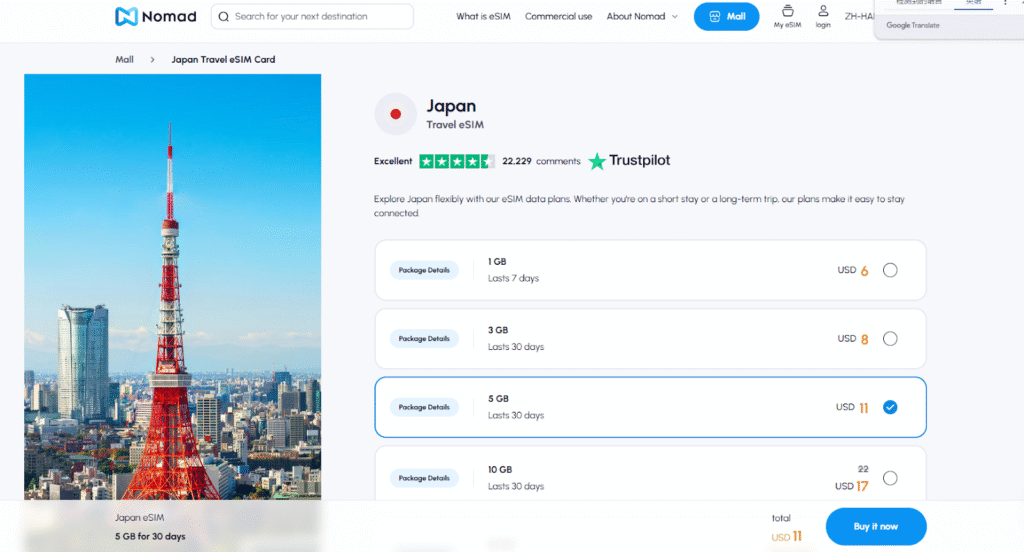 Nomad’s Japan plans start at 1GB for 7 days ($6), 3GB for 30 days ($8), 5GB for 30 days ($11), and 10GB for 30 days ($17). All plans are prepaid, and you can easily top up through the Nomad app, which also displays real-time data usage.