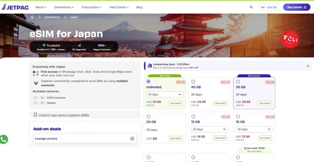 Jetpac is a newer entrant in the eSIM market but is quickly gaining attention for its fast connection speeds and budget-friendly pricing. The platform’s Japan eSIMs are designed for travelers seeking dependable data without complex setup steps. Jetpac also includes simple plan tracking and transparent pricing — no hidden fees.