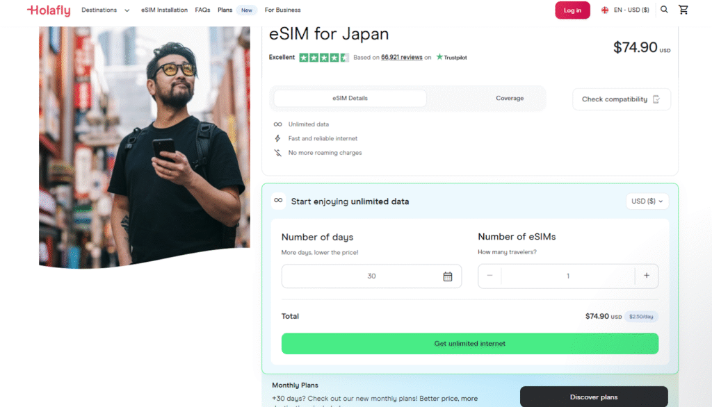 Holafly’s Japan eSIM plans include unlimited data for 5 days ($19.50), 7 days ($27.30) and 30 days ($74.90). While Holafly’s prices are slightly higher than others, the unlimited usage justifies the cost for heavy data users.