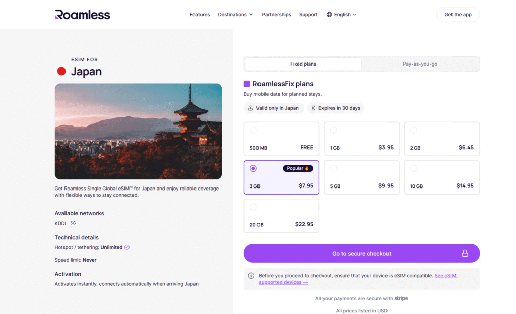 Roamless is an innovative global eSIM provider that combines AI-driven connectivity with real-time pricing optimization, allowing travelers to always get the best available rates.The brand’s app-centered ecosystem lets you manage all your trips and data usage seamlessly, with transparent billing and live tracking. Roamless also supports both personal and business accounts, making it suitable for casual tourists as well as professionals traveling to Japan.