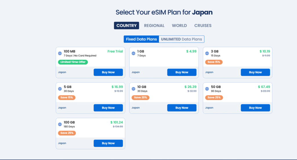 World eSIM’s Japan plans include 3GB for 7 days ($6.90), 5GB for 15 days ($11.95), and 10GB for 30 days ($18.95). Plans are prepaid, and users can monitor or extend data directly through the World eSIM website or app. The platform also supports multi-country bundles, which are ideal for those visiting Japan alongside other Asian countries.