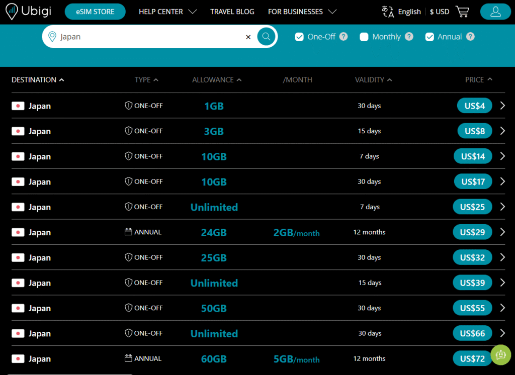 Ubigi offers a 1GB plan for 30 days ($4), 3GB for 15 days ($8), and 10GB for 30 days ($17). You can buy and manage plans through the Ubigi app, which supports instant top-up and multi-country management for those traveling across Asia.