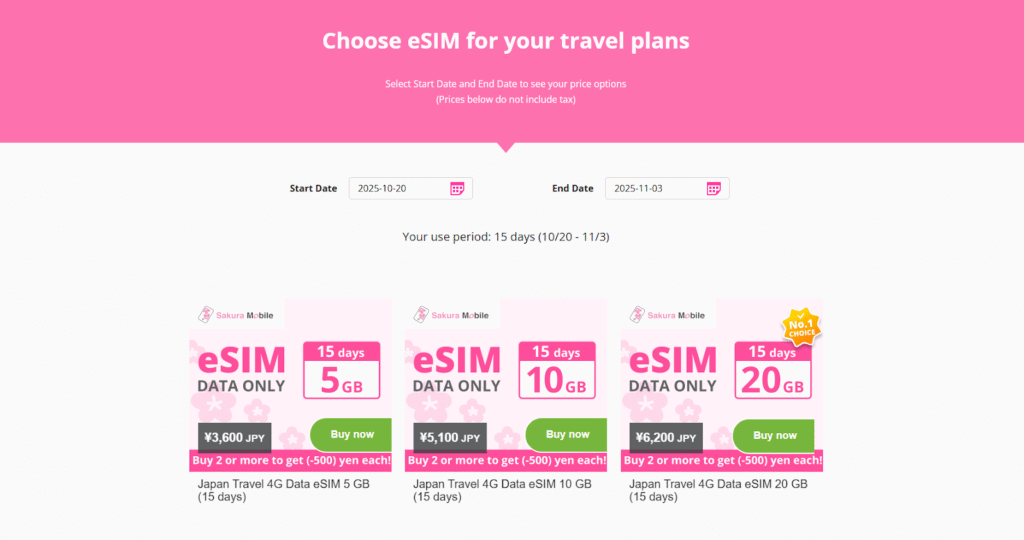 Sakura Mobile offers flexible eSIM data plans, such as 5GB for 10 days at around $22.20,and 10GB for 15 days at $33.80.